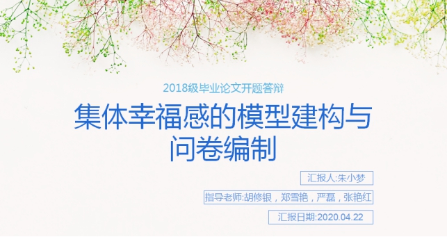 (通讯员 钟燚)2020年4 月22日,第56期社会心理学例会采取线上的方式如期举行。张艳红老师、郑雪艳老师和严磊老师参加了本次例会。本次例会由朱小梦同学汇报她的毕业论文研究设计:“集体幸福感的模型建构与问卷编制”。
