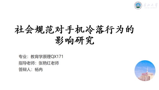 (通讯员 李永雪)2020年5 月20日,第60期社会心理学例会采取线上的方式如期举行。张艳红老师、郑雪艳老师和严磊老师参加了本次例会。本次例会由陈千癸同学主持,杨冉同学进行毕业预答辩:“社会规范对手机冷落行为的影响研究”。