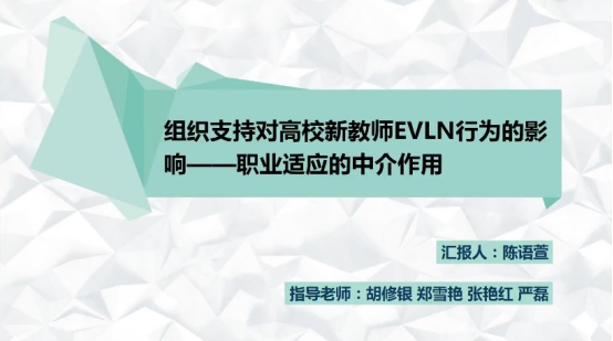 本次例会,由陈语萱同学汇报了研究设计:“组织支持对高校新教师EVLN行为的影响——职业适应的中介作用”。陈语萱同学指出:百年大计,教育为本;教育发展,教师为本。作为高校教师的未来主体,新入职教师教学素养的高低事关高校乃至整个高等教育发展的大局。基于此,陈语萱同学以问卷法对高校新教师组织支持感与EVLN行为(离职/退出行为( Exit) 、建言/呼吁行为( Voice) 、忠诚行为( Loyalty)、忽略行为(neglect))的关系:职业适应的中介作用进行研究,并提出假设H1:组织支持感能够预测EVLN行为(离职行为、建言行为、忠诚行为、忽略行为);假设H2:职业适应在组织支持和EVLN行为(离职、建言、忠诚、忽略)之间起中介作用。
