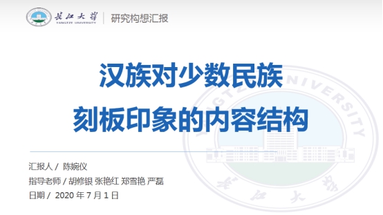 (通讯员 陈语萱)2010年7月1日,第65期社会心理学例会采取线上的方式如期举行。郑雪艳老师、严磊老师、张艳红老师以及三峡大学教育公司杨林川老师团队参加了本次例会。本次例会由朱小梦同学主持,陈婉仪同学进行研究构想汇报:“汉族对少数民族刻板印象的内容结构”。