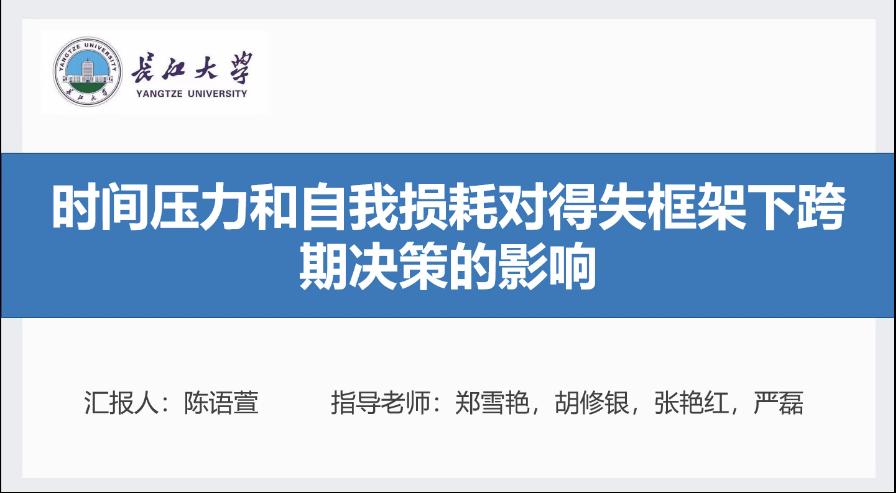 陈语萱汇报的毕业论文题目是《时间压力和自我损耗对得失框架下跨期决策的影响》。研究采取系列实验的方法对时间压力与跨期决策之间的作用机制进行了探讨,研究主要分为两大部分,研究一探究了时间压力对个体跨期决策产生的影响,研究二探究了自我损耗在时间压力与跨期决策之间的中介作用。