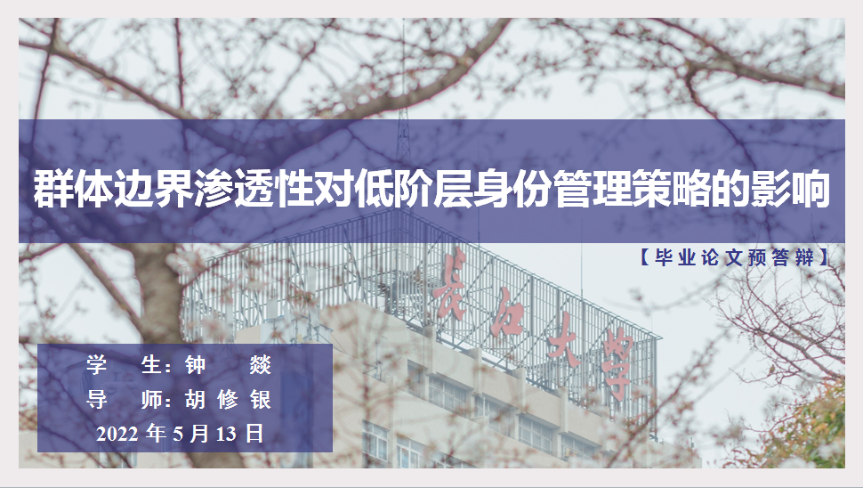 钟燚汇报的毕业论文题目是《群体边界渗透性对低阶层身份管理策略的影响》。研究以社会认同理论为基础,通过一个以中专生为被试的相关研究和一个以成年老员工为被试的实验研究,考察群体边界渗透性对低阶层身份管理策略的预测作用,并探讨两种中间路径的共存。