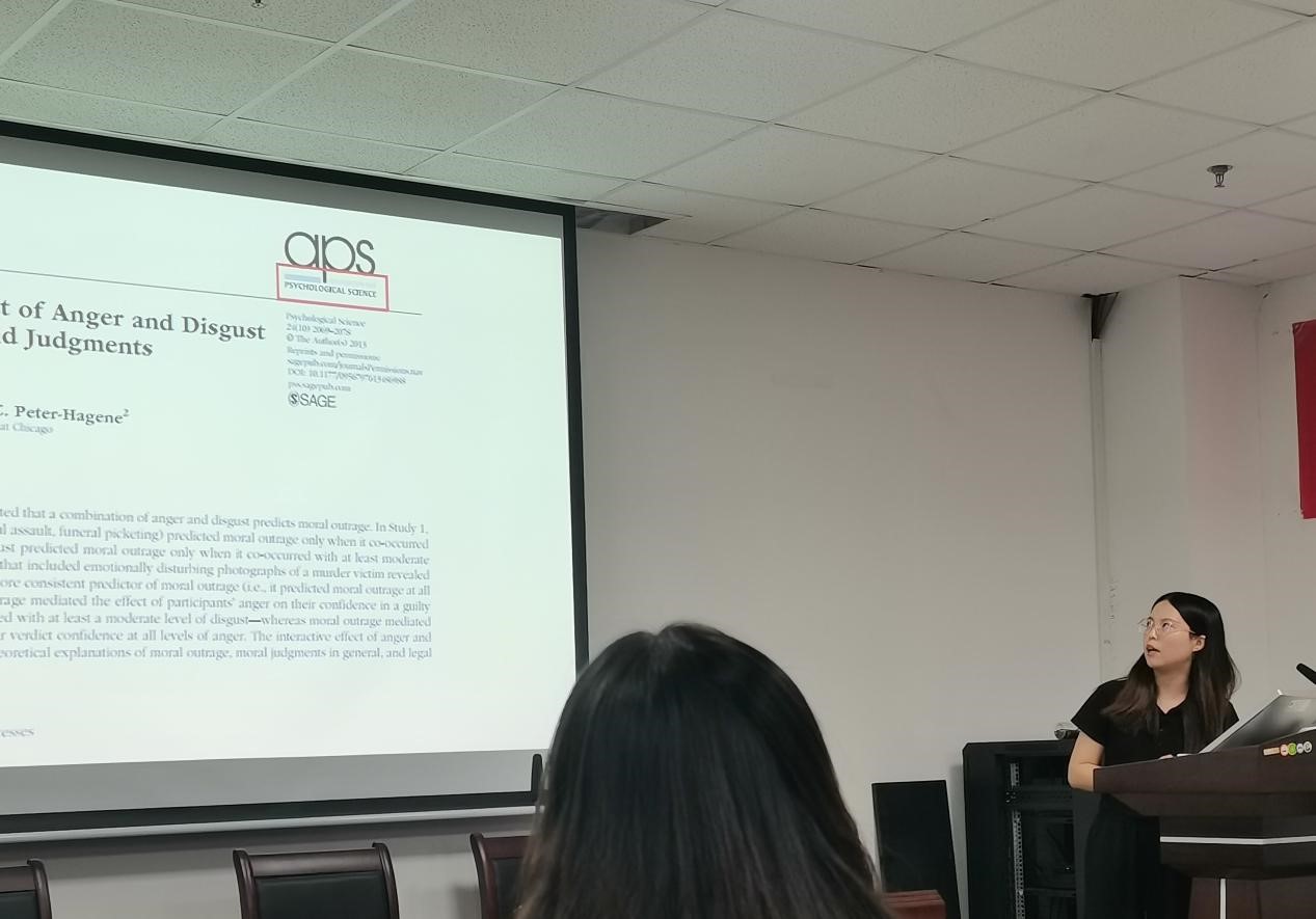 接着研二同学陈旋带来了对,《The Interactive Effect of Anger and Disgust on Moral Outrage and Judgments》的分享,她从研究背景、方法和结果、讨论三个部分对这篇文献进行了详细的讲解。陈旋同学先介绍了道德义愤的概念,并由先前研究和事例提出假设1:a.愤怒在只有与至少适度的厌恶同时出现时,才能显著预测道德义愤;b.厌恶在只有与至少适度的愤怒同时出现时,才能显著预测道德义愤。假设2:a.道德义愤在愤怒与有罪判决信心的关系中起到中介作用;b.道德义愤在厌恶与有罪判决信心的关系中也存在中介作用。假设3:a.愤怒在只有与至少适度的厌恶同时出现时,道德义愤在愤怒与有罪判决信心的关系中才起到中介作用;b.厌恶在只有与至少适度的愤怒同时出现时,道德义愤在厌恶与有罪判决信心的关系中才起到中介作用。本文通过回归分析验证了相关假设。在最后,朱晓伟老师提出了关于本篇文章研究的可行建议,并希望同学们好好学习借鉴本文章的方法。连帅磊老师也提到同学们写文章时可以选用本文用到的简单效应分析方法。