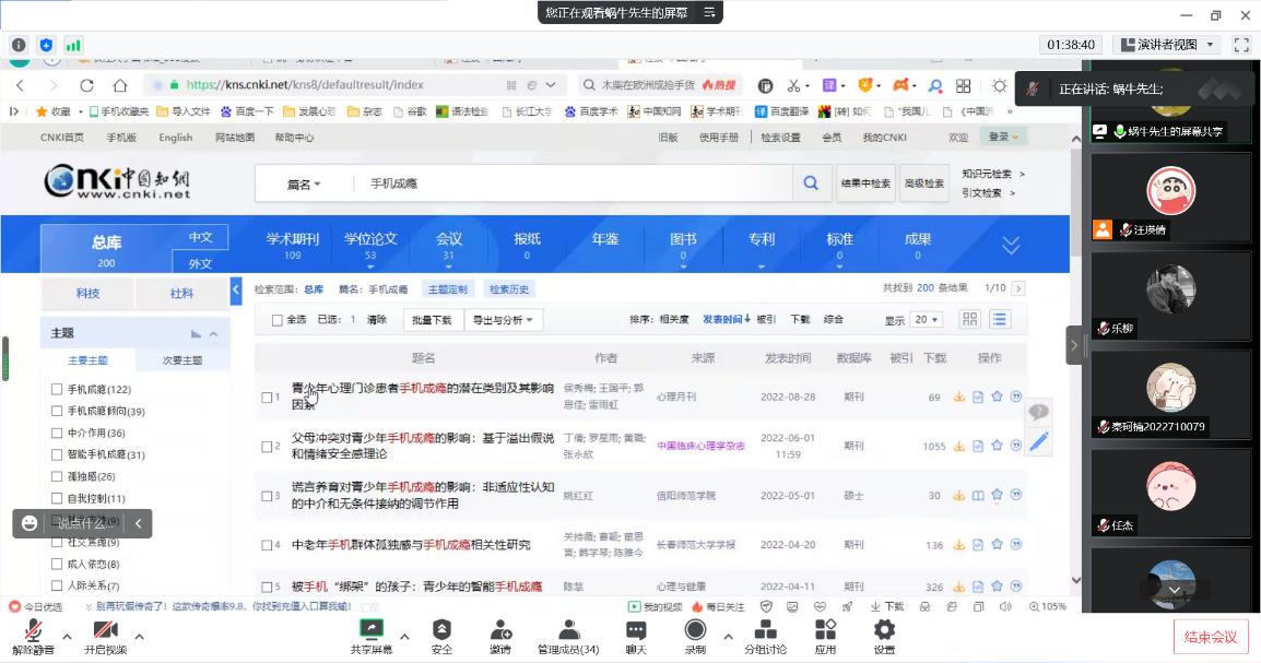 (通讯员 汪瑛倩)2022年10月09日晚7点,第53期青少年网络心理与行为专题例会在线上召开。此次例会共30余人,包括硕士生导师连帅磊老师和课题组的研究生,以及部分本科生。本次会议由陈晓男同学汇报文献,连帅磊老师讲解文献查阅方法,由汪瑛倩同学负责本次的会议记录。