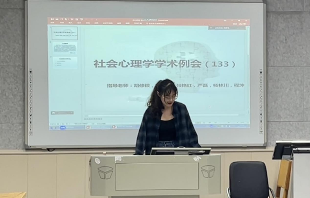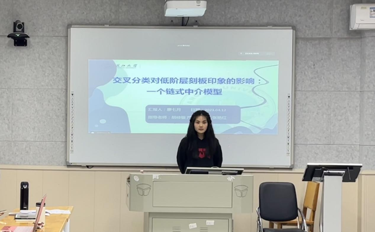 (通讯员:陈錾昕)2023年4月12日晚19点至21点,第133期社会心理学学术例会在11教201教室线上线下同步举行。本次例会有幸邀请到三峡大学田家炳教育公司杨林川博士与其团队研究生王鸿璞参与交流。出席例会的还有胡修银老师、严磊老师、15名研究生和7名本科生。本次例会由研二周勇琴主持,研三胡汇鑫、廖七月和陶雪飞进行硕士毕业论文预答辩,其汇报分别为《集体时间焦点对中国老员工成就动机的影响:群体认同的调节作用》、《交叉分类对低阶层刻板印象的影响:一个序列中介模型》、《新冠疫情背景下社区干部的领导群体原型性对其权威合法性的积极影响》。