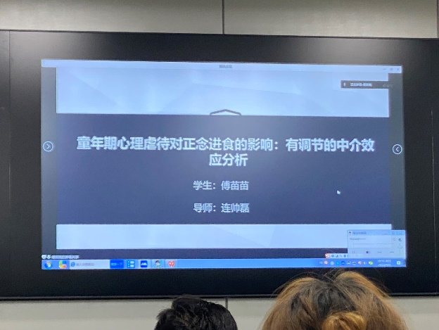 首先由研三傅苗苗同学进行线上的毕业论文预答辩,论文题目为《童年期心理虐待对正念进食的影响:有调节的中介效应分析》,傅苗苗同学从文献综述、方法、结果、讨论四个方面对论文进行了汇报。她首先对正念进食、心里虐待、情绪调节灵活性、自然联结四个变量进行了文献综述的梳理,接着对自己的研究方法进行了介绍,最后就结果和讨论为我们阐述。