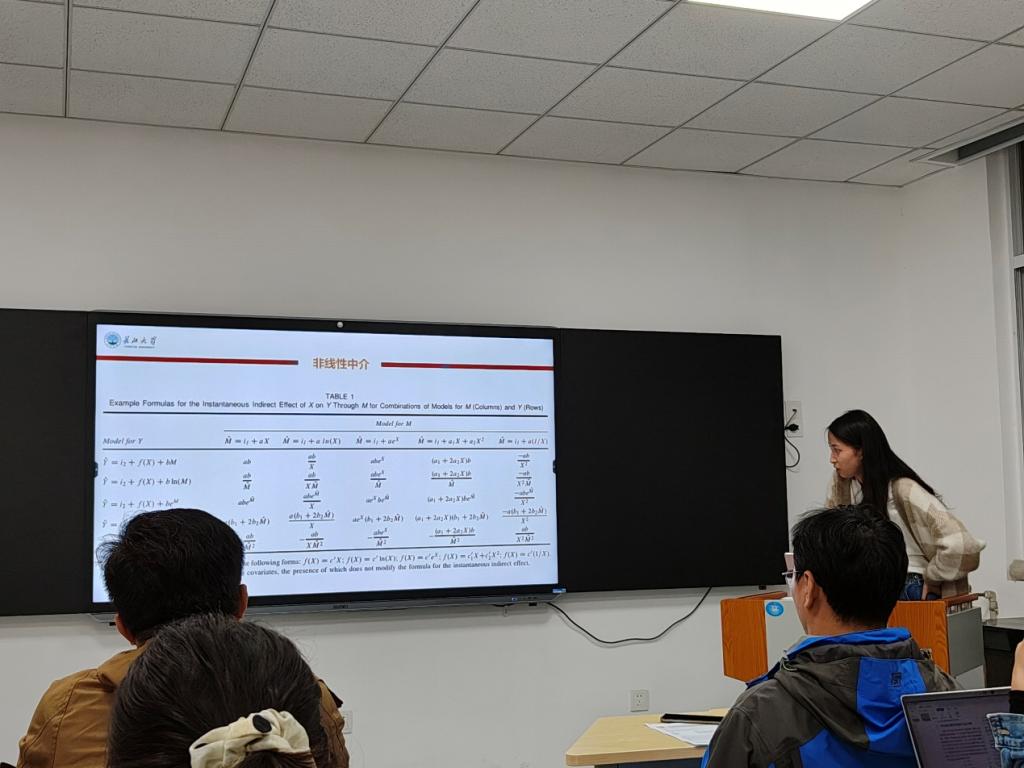 首先在介绍《非线性中介效应分析》一文之前, 曹晓萱同学带我们回顾了上学期由黄贝同学分享的文章《Does beautification technology use affect appearance anxiety? An exploration of latent mechanisms》中的研究,然后开始分享发表在2014年发表在《心理科学进展》的《非线性中介效应分析》一文,从线性中介、非线性中介以及非中介效应的检验方法这三个部分完成了本次分享。在汇报过后,连老师提出要积极学习各种各样的数据分析方法,谈到没有不显著的关系,只是方法没用对,分析方法的积累对于研究来说也是至关重要的一环。
