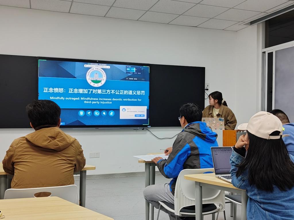 紧接着,程丽媛同学汇报了于2023年发表在《Organizational Behavior and Human Decision Processes》杂志上的文章《Mindfully outraged :Mindfulness increases deontic retribution for third-party injustice》。该文章在正念镇静假说的基础上提出一个与其完全相对立的正念激活假说,文章中通过大量研究来验证其中所提出的假设,包括日记观察法和实验法等,程丽媛同学将每一个研究都一一分析为我们带来了相当精彩的讲解。在汇报过后,老师同学们展开了激烈的讨论,讨论过后朱老师谈到在分析实验的过程中要将其中的自变量的操作方式、无关变量的控制手段以及因变量的观测方法把握清楚。之后连老师谈到在阅读文献的过程中要注重其中的内在逻辑发现其中的创新点从而积累经验用于自己的研究当中。