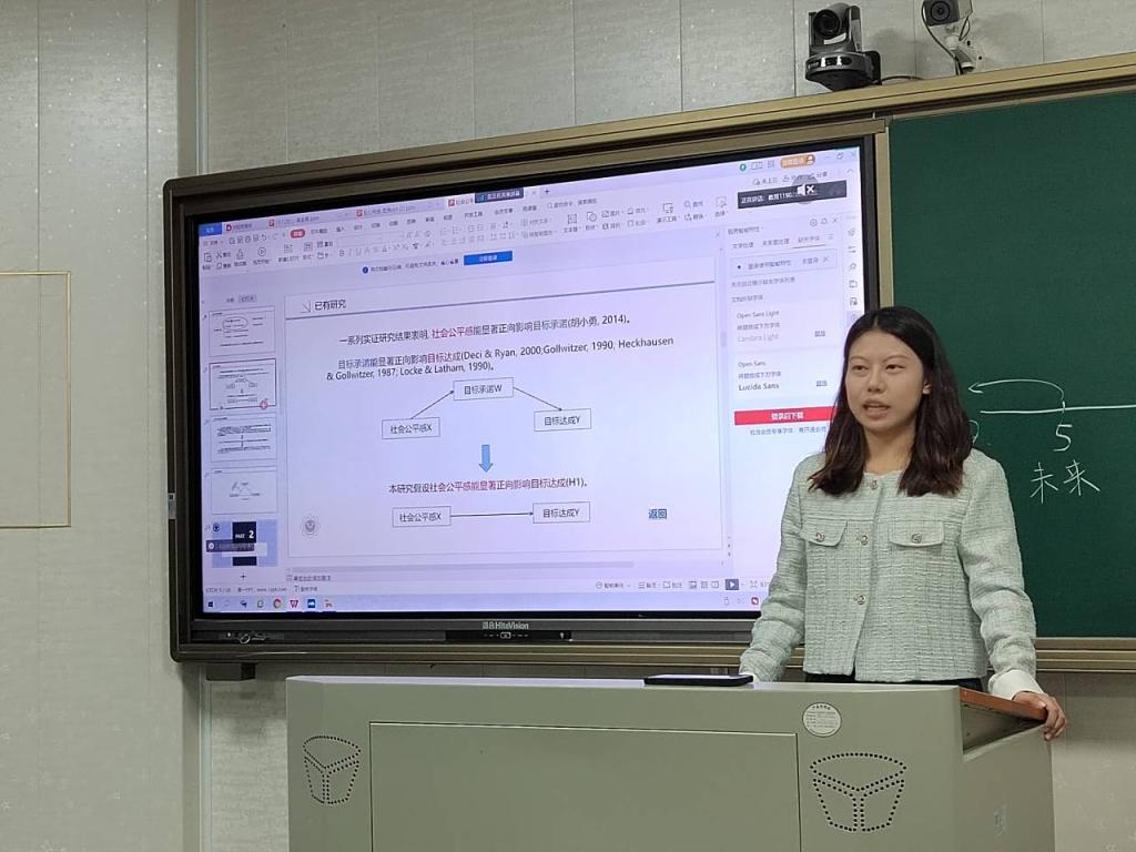 参加本次例会的老师还有郑雪艳老师、严磊老师、甘进华老师、特邀嘉宾杨姗姗老师以及10名心理学研究生、12名本科生科研助理,6名旁听本科生。本次例会由研一周久远同学主持,由吴含笑和胡倍嘉进行文献分享汇报,其汇报主题分别为《生命史策略框架下时间焦点对内隐时空映射的影响》和《社会公平感对不同阶层目标达成的影响及其过程》。