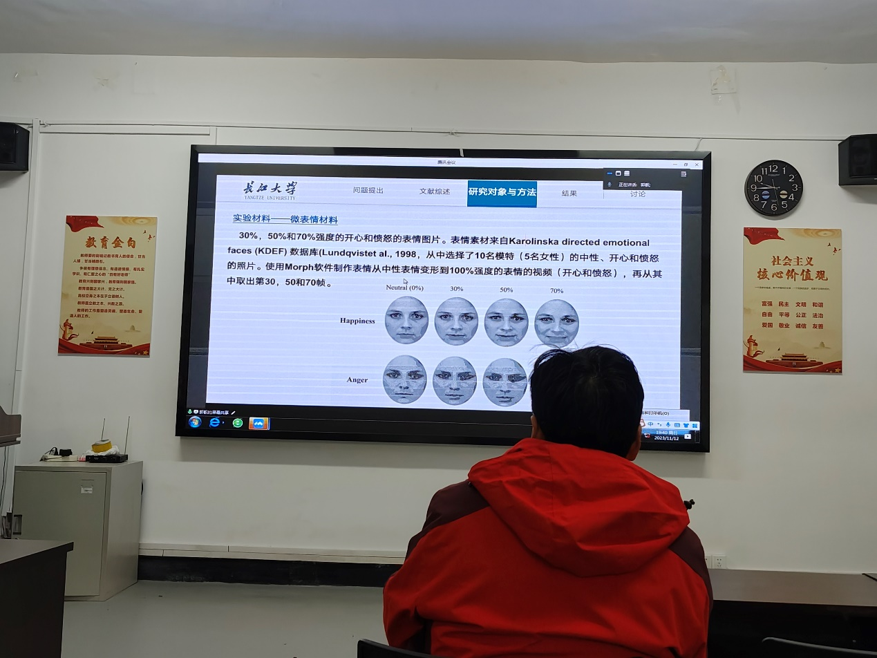 由于郭靓同学在外地实习,所以采取腾讯会议线上汇报形式进行。本次郭靓同学汇报的文献题目为《Sensitivity and response criterion in facial microexpression recognition among internet gaming disorder》,主要从问题的提出、文献综述、研究对象和方法、结果、讨论五个部分进行汇报,汇报过程十分流畅,由于现场设备原因没有交流沟通环节,因此朱老师针对该篇文献谈到了许多值得我们积累学习的地方。