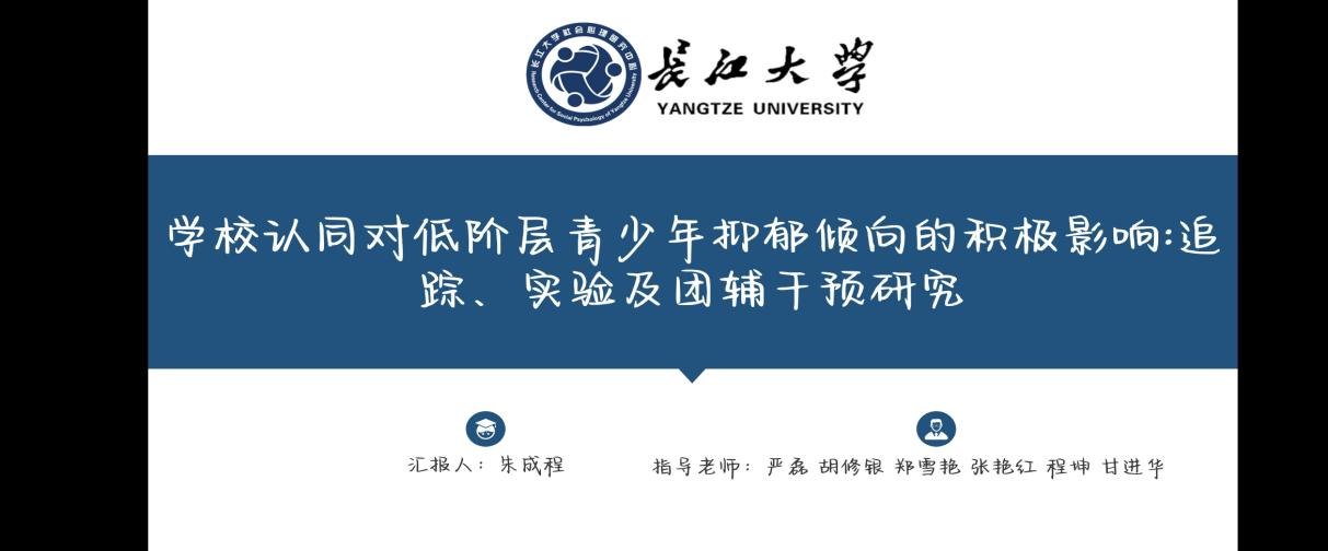 接着是朱成程同学的汇报,从研究背景、研究方法和过程、后续工作安排三个方面来展开,从社会认同视角出发,探讨公司认同对低阶层青少年抑郁的积极作用。研究一使用追踪设计,探讨公司认同对对低阶层青少年抑郁的积极效应;研究二使用失败任务范式,考察公司认同是否可以缓解消极情绪;研究三,设计团辅干预,通过提高学认同降低阶层青少年的抑郁倾向。