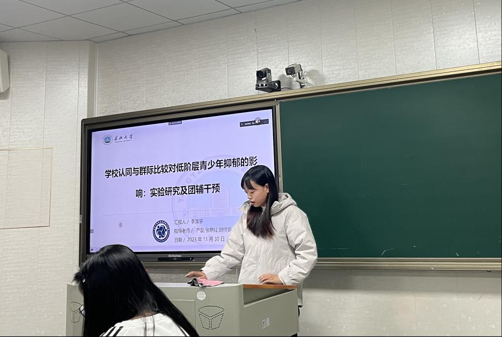 其次,李澳慧同学进行汇报,其内容基于社会认同视角,考察公司认同、群际社会比较对低阶层青少年抑郁的影响。研究1采用2*2的被试间实验设计,探究公司认同与群际社会比较对低阶层青少年的抑郁是否存在交互作用,研究假设向下的群际社会比较“放大”公司认同的积极作用,而向上的群际社会比较具有相反的作用。研究2设计团体辅导活动,通过改变低阶层的群际社会比较方向干预低阶层青少年的抑郁。