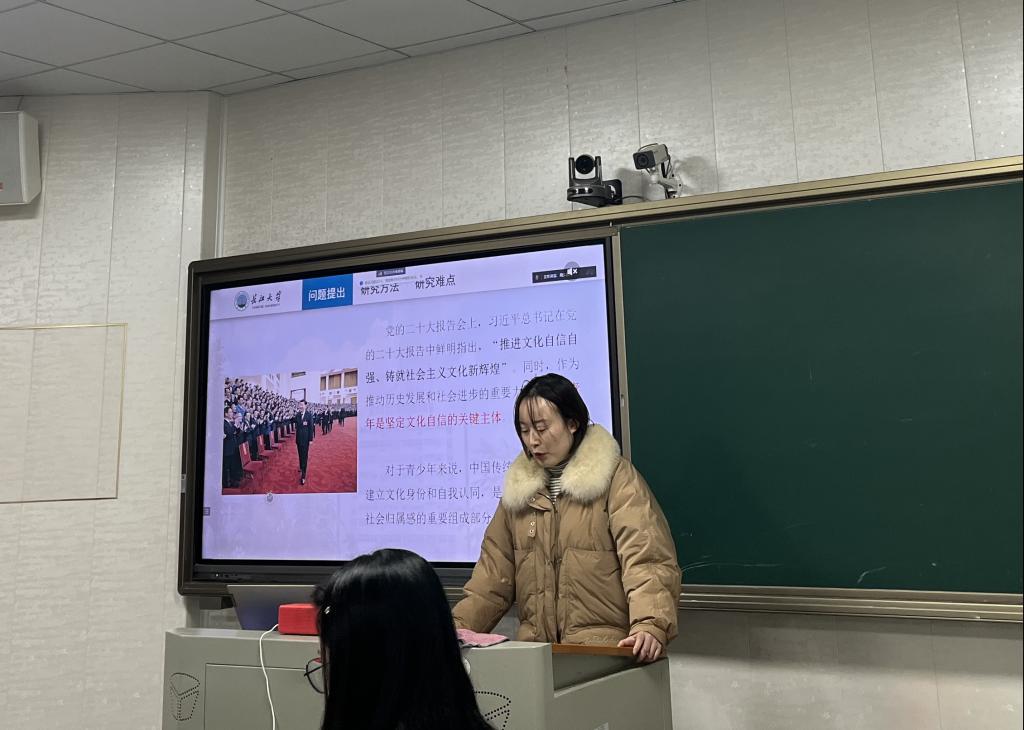 首先,魏文欣同学进行汇报,其汇报从社会认同威胁理论出发,拟探讨接触有关中国传统文化的负面信息对青少年文化自信影响的心理机制。主要包括两个研究内容,研究一使用实验法探究接触到涉及中国传统文化的负面信息后青少年文化自信的变化,并考察认知灵活性的调节作用。研究二是对认知灵活性的团体辅导干预研究。