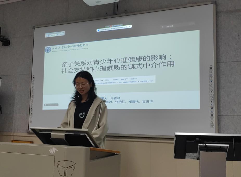 最后,肖香君同学汇报的文献采用问卷法调查了四川、辽宁、湖北、安徽、福建、山东、云南等23个省(市)的中员工亲子关系、社会支持、心理素质和心理健康水平,探讨了亲子关系与中员工心理健康之间的内在作用机制以及社会支持和心理素质在其中的中介作用,为中员工心理健康问题的预防和干预提供了实证依据,为家校合作扩展了新的路径。
