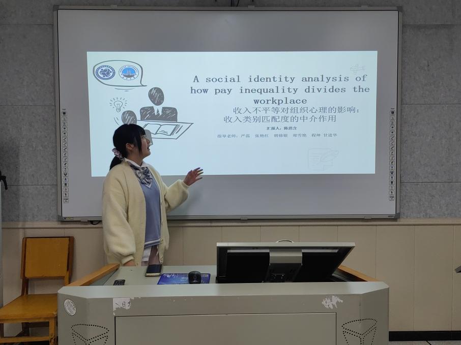接着,王悦慧同学从研究背景、实验设计及自身感悟等方面展开汇报。该研究就一般民众对“后天型”富人的好感与期待、“后天型”富人对穷人的支持与同情两方面进行探讨。结果表明:(1)一般民众对“后天型”富人更有好感,更期待“后天型”富人对穷人有支持和同情;(2)“后天型”富人认为提高社会经济地位容易,对穷人有较少的支持和同情。