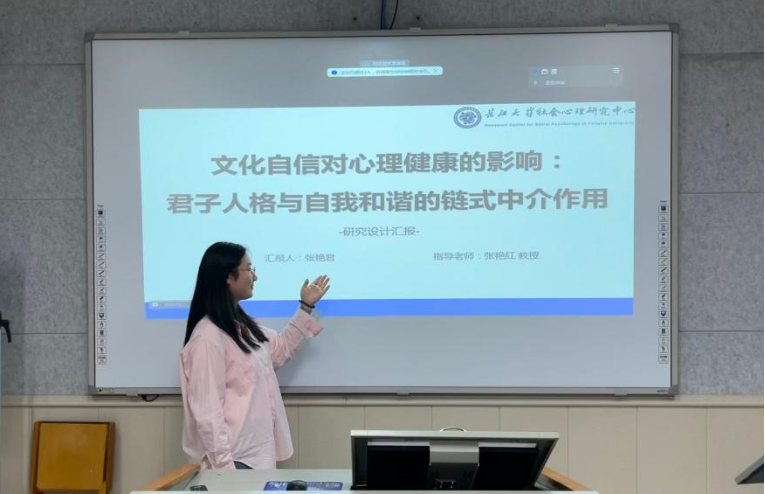 在当今社会,心理健康问题日益受到关注。与此同时,文化自信作为一种新兴的概念,逐渐成为心理健康研究领域的重要内容。张艳君同学从问题提出、研究方法、预期结果、研究困惑四个方面展开汇报,其研究设计从文化与心理相互构成理论出发,探讨了文化自信对心理健康的影响。主要包括两个研究:研究一采用问卷法与实验法考察了外显文化自信与内隐文化自信的关系;研究二采用问卷法与实验法进一步揭示了外显文化自信/内隐文化自信对心理健康的影响以及君子人格与自我和谐在其中的作用机制。