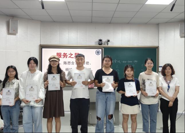 然后,获得2023-2024学年长大社心年度“服务之星”荣誉称号的员工是:应心12202班姚露馨、应心12201班高馨燚、应心12202班陈思含、应心12202班王悦慧、应心12101班肖香君、教育12101班杨绅毅、学前12101班令狐余佳,由郑雪艳老师为以上获奖者进行颁奖。