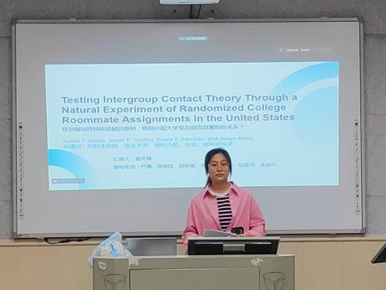 最后是夏文婕同学对《按照增加跨种族接触的原则,强制分配大学室友能否改善群际关系》进行汇报。本研究利用随机分配室友的自然实验,测试了基于室友种族的室友关系、态度和行为变化。研究发现表明,在大公司园的背景下,随机分配室友政策是促进跨种族接触的有效途径,且对关系质量的负面影响有限。