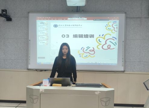 现任副主编高炎同学就公众号排版对成员进行培训。她以一篇新闻稿为例,详细演示了使用秀米排版的全过程,并介绍了用可画制作海报的方法,为编辑部成员提供了诸多干货,助力编辑部新任成员们夯实专业能力。