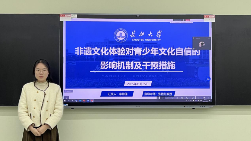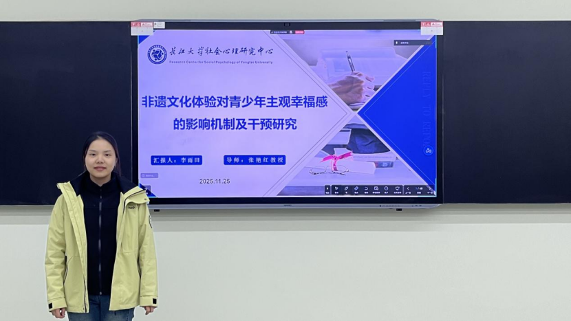 首先,李雨田同学进行了毕业论文开题报告,其论文题目为《非遗文化体验对青少年主观幸福感的影响机制及干预研究》。