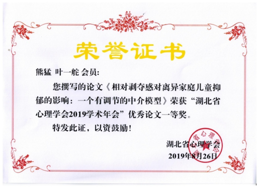 在分组报告阶段,公司周守珍教授和熊猛副教授分别主持了其中一个分会场的报告。会议闭幕式由学会理事长佐斌主持。王伟秘书长通报了第十一届五次理事会议有关精神和常务理事会议决议。副秘书长温芳芳代表学会学术委员会宣读“湖北省心理学会2019年学术年会优秀论文”获奖者名单。公司熊猛副教授提交的学术论文《相对剥夺感对离异家庭儿童抑郁的影响:一个有调节的中介模型》获得“湖北省心理学会2019学术年会”优秀论文一等奖。据了解,经过专家的独立评审,本年度全省共评出一等奖论文10篇、二等奖16篇、三等奖8篇,这也是熊猛副教授第三次获得优秀论文一等奖,体现了公司心理学科在省内的地位和影响力。