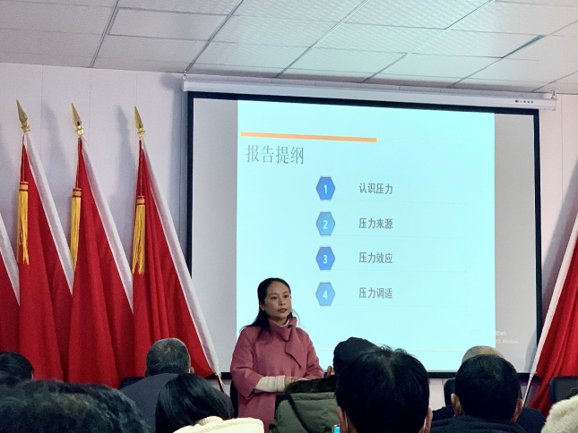 张艳红博士以心理压力与调适为主题展开讲座,从认识压力、压力来源、压力效应和压力调适四个方面展开。在认识压力层面,张老师从物理学和心理学层面介绍了压力的界定。同时,从心理学感觉剥夺实验入手,表明没有压力也未必是好事情,重点是学会认识和识别压力。在压力来源层面,张老师介绍了压力来自于内外部层面。常见的压力源可以分为人格因素、个人生活因素、工作因素、遭遇性压力源、情境性压力源和预期性压力源。在压力效应层面,张老师介绍了压力的两面性,即压力的积极效应和消极效应。压力的积极效应包括压力是生活和工作的动力源、自身不断奋斗的目标、压力可以挖掘自己的潜力。压力的消极效应是指压力让人消极的面对生活、出现身体上的疲劳等。但是重点是要实现压力与承受力之间的动态平衡,使压力达到最佳平衡点,也就是绩效高峰。在压力管理和调适层面,张老师介绍了压力诊断、压力预防、压力缓解、情绪应对、问题解决等方面。压力预防包括尽早规划、早作准备以及制定合理的目标。压力缓解可以从启动自身压力阀开始,在工作辛苦时休息片刻,呼吸新鲜空气,找朋友倾诉和保证充足的睡眠。同时,运用正念冥想法来提高自身的专注力。从心理学情绪的ABC理论入手,强调要将负向思维和情绪转向于正向思维和情绪。问题应对层面,要做到理解他人、理解自己、保护自己、丰富自己的沟通技巧。