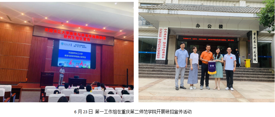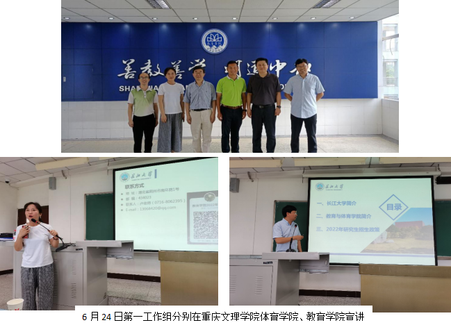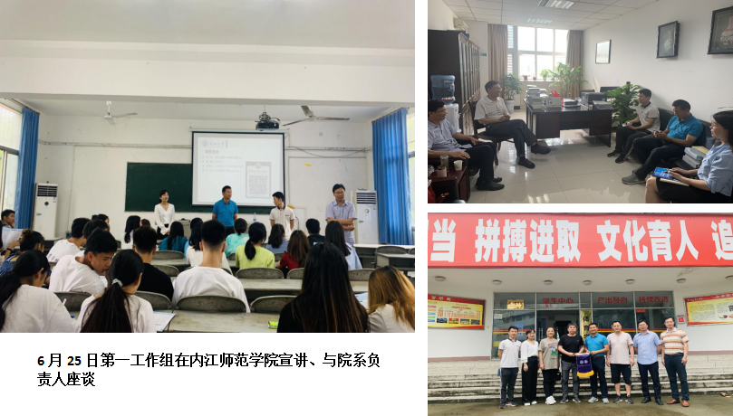 第一工作组由副经理杜光友带队,研究生导师宋永晶副教授及心理系主任朱晓伟博士一行3人,于6月22日至25日前往西南线的长江师范公司、重庆第二师范公司、重庆文理公司、内江师范公司4所高校开展研招宣传活动。第一工作组分别在长江师范公司体育与健康科学公司、重庆第二师范公司教育教师公司、重庆文理公司体育教育公司、内江师范公司的体育公司(教育公司员工亦一并参会)开展招生宣讲活动。招生宣传现场气氛热烈,员工们报考公司意愿强烈。