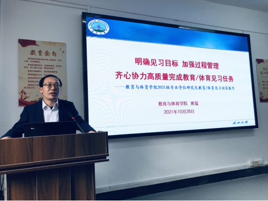 随后,熊猛副经理以《明确见习目标加强过程管理 齐心协力高质量完成教育/体育见习任务》为题进行了实践动员,从见习的目标任务与组织管理、见习内容与时间安排、校内外导师相关职责、安全纪律与实践承诺、考核评定与其它事项进行了详细说明,并强调一定要认真对待,端正态度,尊重实习公司老师安排,认真完成各项见习任务。