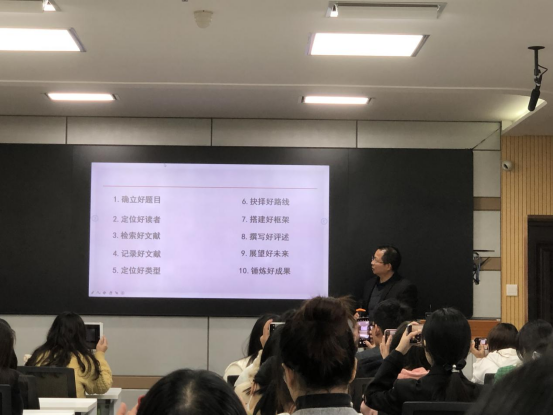 徐红教授以《撰写文献综述的十大要诀》为主题,从确立好题目,定位好读者、检索好文献、检索的步骤、定位好类型、抉择好路线、搭建好框架、撰写好评述、展望好未来、锤炼好成果十个方面展开论述。并通过实例讲解了每一步骤的实际操作方法;如可以在哪里检索文献、检索方法、检索步骤等实用问题。