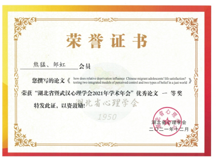 在心理学前沿报告环节,熊猛副教授作了题为《处境不利儿童的相对剥夺感与心理社会适应:基于外显、内隐及追踪研究的证据》的大会报告,对其团队近6年来的研究成果进行了全面梳理和系统介绍,受到参会代表的高度评价和一致好评。闭幕式上还举行了“湖北省暨武汉心理学会2021年学术年会”优秀论文颁奖仪式,熊猛副教授提交的研究成果《How does Relative Deprivation Influence Chinese Migrant Adolescents’ Life Satisfaction? Testing Two Integrated Models of Perceived Control and Two Types of Belief in a Just World》荣获优秀论文一等奖。