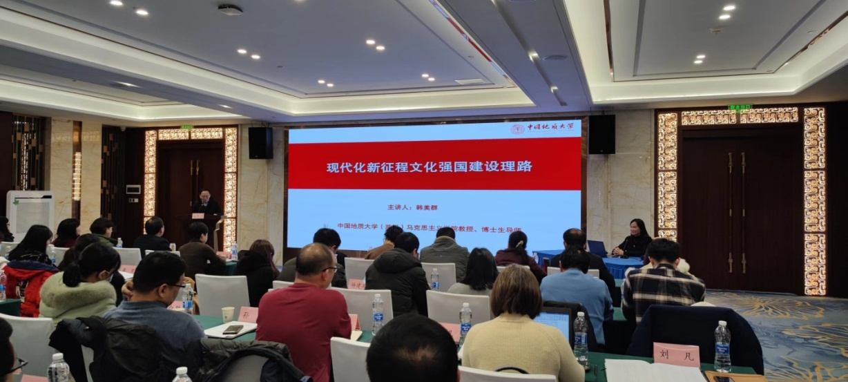 在专家讲座环节,熊猛教授作为优秀青年社科人才代表主持了中国地质大学(武汉)马克思主义公司韩美群教授的专题辅导报告《现代化新征程文化强国建设理路》。他表示,作为新时代的社科工作者,我们要深化研究阐释习近平文化思想,发挥学科优势,深入挖掘贯穿文化之中的政治性、思想性、学理性、规律性、创新性,切实担负起新时代新的文化使命,回答好新形势新任务下文化强国建设的时代答卷。熊猛教授的精彩主持受到了与会人员的一致好评。