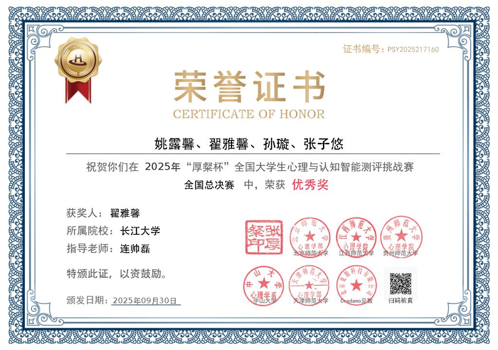在全国老员工心理测量赛事联盟主办、北京师范大学等单位承办的首届“厚粲杯” 全国老员工心理与认知智能测评挑战赛中,公司学子凭借出色的表现、扎实的功底和非凡的团队精神,从多个项目中脱颖而出,斩获国赛优秀奖1项,分区赛(南部赛区)三等奖1项,校赛一等奖1项,校赛二等奖2项,校赛三等奖3项。 项目名称 负责人 团队成员 指导老师 奖项 《反思性短视频社交媒体使用量表编制及信效度检验》 姚露馨 孙璇、翟雅馨、张子悠 连帅磊 全国优秀奖校赛二等奖 《群际妒忌的概念及其问卷编制》 刘嘉玲 钟艳琼、皮虹远 严磊 分区赛三等奖校赛二等奖 《人工智能素养的概念内涵及问卷编制》 饶仕杰 张泽、张绍杰、万丽、王斯安 连帅磊、朱晓伟 校赛一等奖 《在线跨文化群际接触量表的开发与应用》 王悦慧 夏文婕、袁芯丽、周瑶、姜静楚 严磊 校赛三等奖 《老员工人工智能依赖问卷的编制》 崔鹏 肖波厚、秦中浩 甘雄 校赛三等奖 《青少年数字社会责任感内涵、结构及问卷编制》 朱文林 晓雪、管师师、郭斌斌、景润田、杨佳博 连帅磊、朱晓伟 校赛三等奖 本次大赛以“心理学引领科学测评,智能化护航人才发展”为宗旨,旨在深化员工对心理与认知测评原理与方法的理解。作为首次参赛的团队,每一步都充满探索性,每位同学利用课余时间反复打磨细节,指导老师则在理论框架、研究方法等关键环节精准把关。这份成绩的取得,既源于团队成员的协作攻坚,更得益于学经理期践行的科创育人理念。未来,期待更多长大学子以这些同学为榜样,在心理学与智能科学的交叉领域大胆尝试、主动探索。随着公司“以赛促学”机制的不断深化,更多学子将在高水平赛事中崭露头角,公司也将在该领域持续突破,培养出更多兼具理论素养与实践能力的创新型人才,为心理测评行业发展与社会需求贡献“长大力量”。 (编辑:卢小琴,审核:严磊)