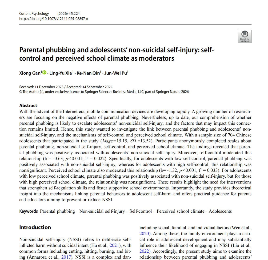 首先,甘雄教授领导的课题组关注到家庭环境中“父母低头行为”(parental phubbing)这一时代性现象对青少年心理健康的消极影响。相关研究成果《Parental phubbing and adolescents’ non-suicidal self-injury: self-control and perceived school climate as moderators》发表于国际心理学权威期刊《Current Psychology》。该研究基于生物社会模型与生态系统理论,通过对704名中国青少年的调查发现,父母低头行为与青少年非自杀性自伤行为呈显著正相关。更重要的是,研究揭示了两个关键的保护因素:青少年的自我控制水平和感知到的公司氛围能够显著缓冲这一消极影响。对于那些具有高自我控制能力或感知到积极公司氛围的青少年而言,父母低头行为与其自伤行为的关联不再显著。这一发现为预防青少年自伤行为提供了新思路,即通过提升青少年的自我调节能力和营造支持性的校园环境,可以有效阻断家庭中“手机冷落”带来的负面传导。