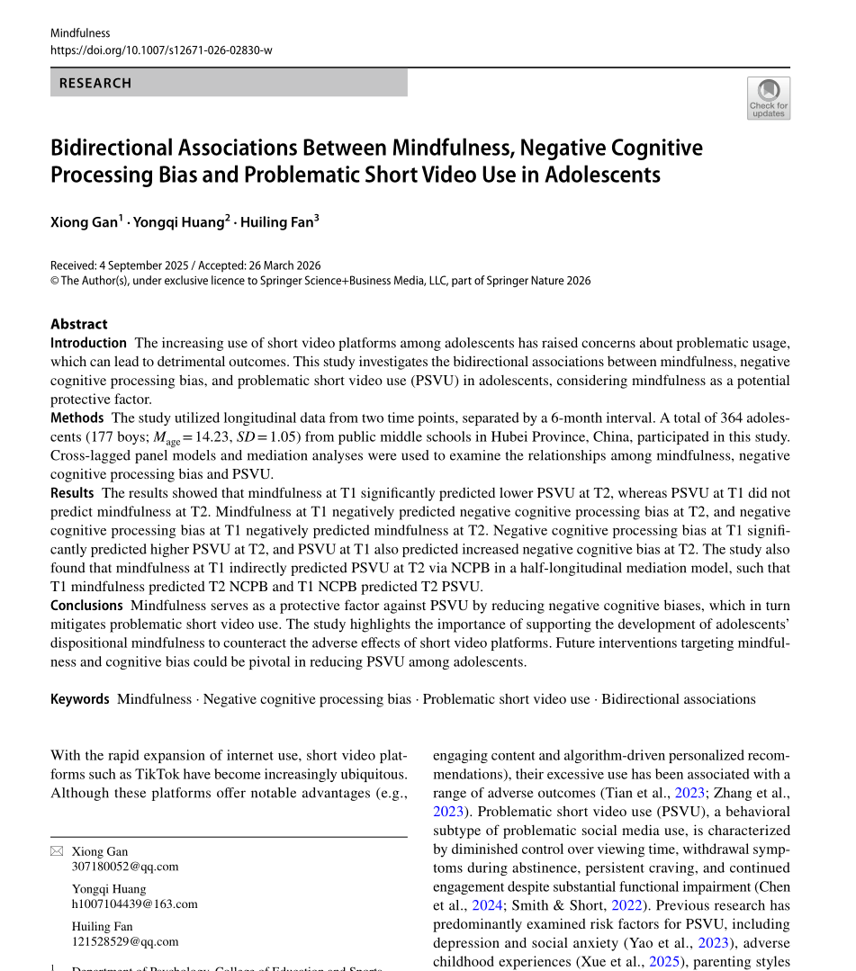 最后,课题组聚焦于青少年短视频成瘾问题,探讨了其内在的心理保护因素。研究成果《Bidirectional Associations Between Mindfulness, Negative Cognitive Processing Bias and Problematic Short Video Use in Adolescents》发表于《Mindfulness》期刊。该研究采用纵向数据,基于积极青少年发展理论与I-PACE模型,揭示了正念与青少年问题性短视频使用之间的双向关系。研究发现,正念水平高的青少年能显著降低未来问题性使用的风险,并且这种保护作用部分是通过减少其负性认知加工偏向实现的。同时,研究也证实了负性认知加工偏向与问题性短视频使用之间存在相互加剧的恶性循环。这一成果强调,培养青少年的正念能力不仅是促进心理健康的重要途径,更是抵御短视频成瘾的有效心理资源。