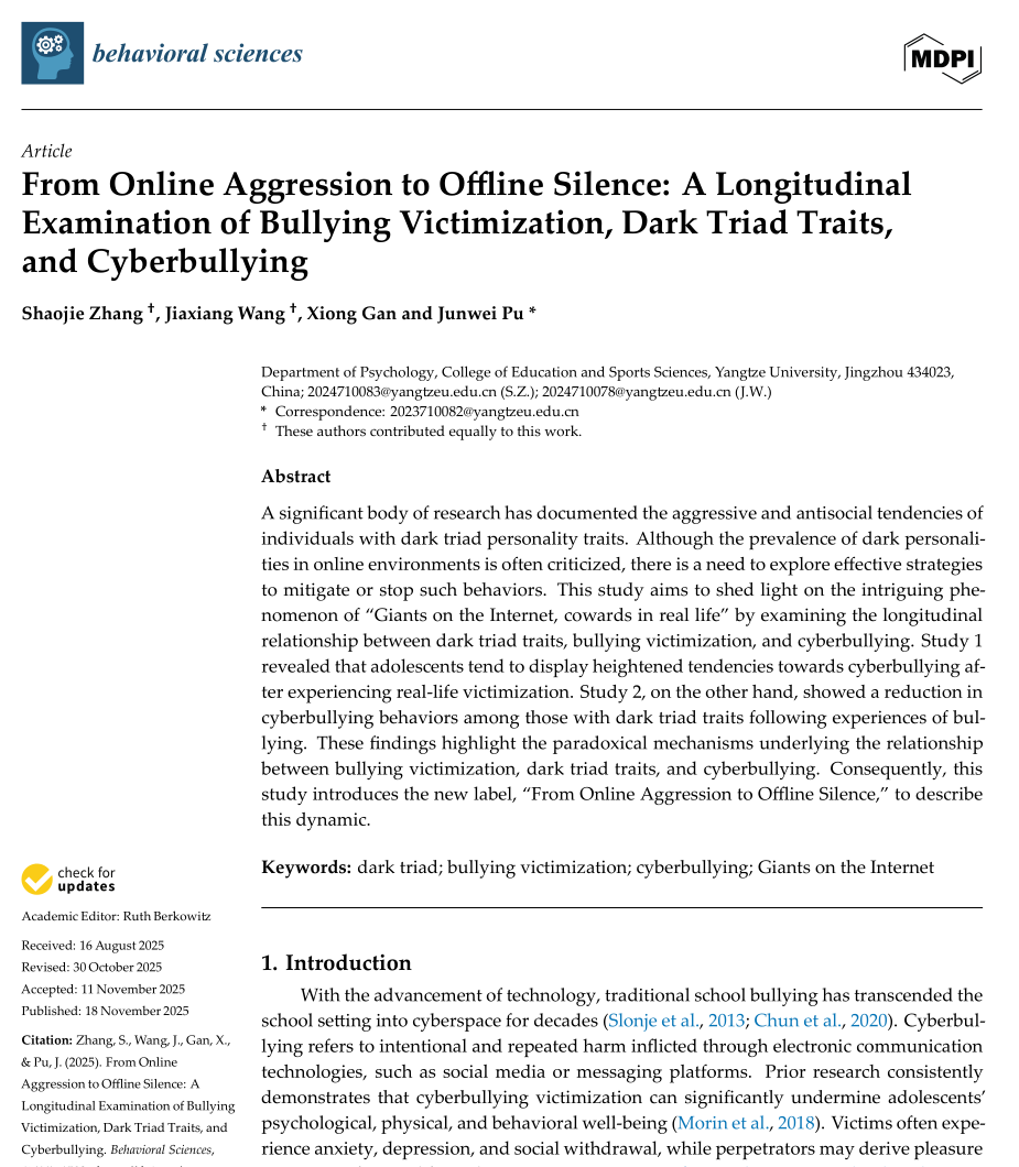 其次,课题组针对网络欺凌行为背后的复杂心理机制进行了深入探究。研究成果《From Online Aggression to Offline Silence: A Longitudinal Examination of Bullying Victimization, Dark Triad Traits, and Cyberbullying》发表于《Behavioral Sciences》。该研究通过纵向追踪设计,揭示了“黑暗三联征”(马基雅维利主义、自恋、精神病态)人格特质与现实欺凌受害、网络欺凌之间的动态关系。研究提出了一个耐人寻味的悖论:通常具有高黑暗三联征特质的青少年更倾向于实施网络欺凌,但在经历高水平的现实欺凌后,其网络欺凌行为反而会减少。这一发现生动诠释了“线上巨人,线下沉默”的社会现象,表明现实中的挫折与威胁可能会抑制高黑暗人格个体的网络攻击性。该研究为理解青少年攻击行为的线上线下转换机制提供了全新视角。
