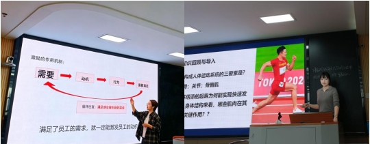 在课堂教学展示环节,四位教师依次进行20分钟现场授课。杨雪老师讲授《班级常规管理》,教学结构规范、逻辑清晰;闫景蕾老师讲授《鲍文的代际模型》,课堂氛围活跃、互动性强;甘进华老师以"亚当斯的公平理论"为主题,采用"一例到底"案例教学法,实现课程思政与理论拓展有机融合;陈子扬老师围绕"体育动作的解剖学分析与应用",灵活运用3D Body虚拟解剖APP等信息化手段,注重理论与运动实践结合。