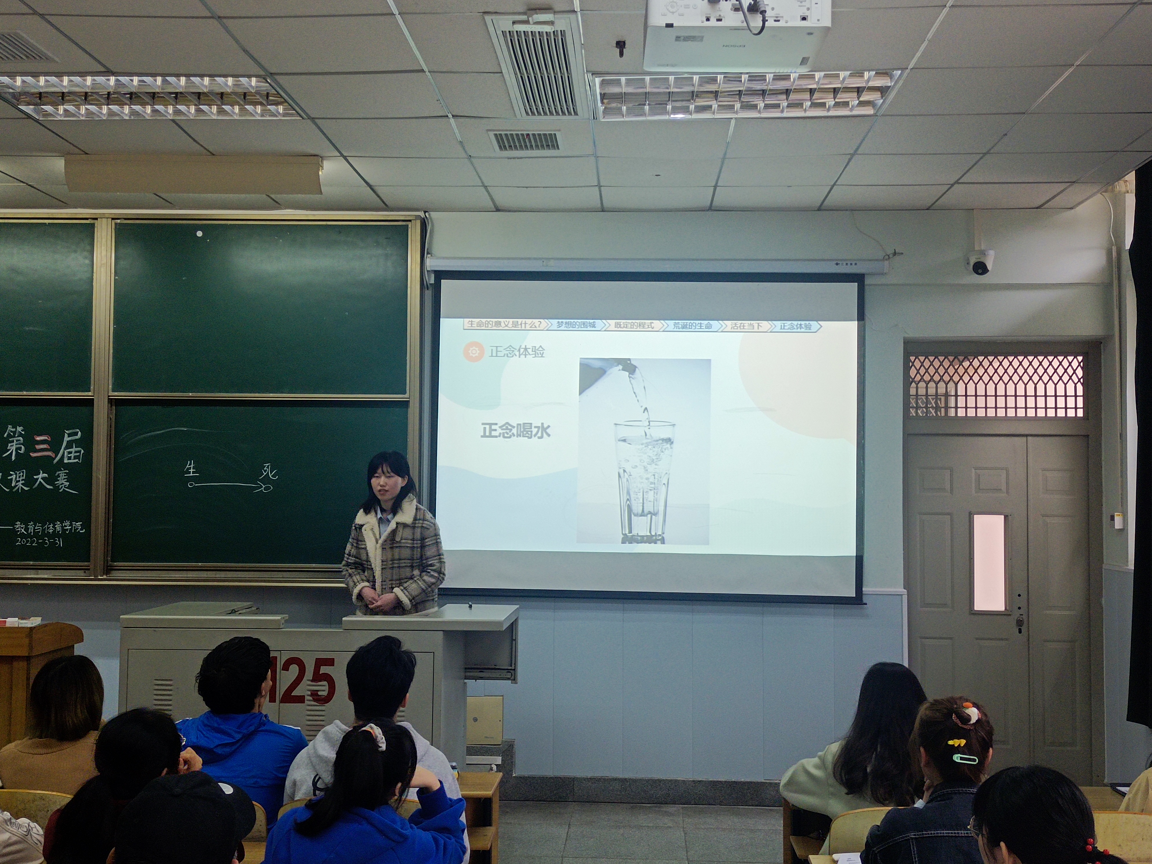 在正式比赛中,2号选手吴云首先在课堂上邀请同学们做一个画圆游戏,并询问是否有同学真的画出了完美的圆,然后以此为切入点,教育同学们用乐观积极的心态去拥抱不完美。“我们终将死去,努力生活是为了什么?”5号选手邵雅清一开课便辅以短视频引入令人沉思的问题,随后向同学们指出,由生到死,能够把握的便是活在当下,最后她邀请并指导同学们做有关“正念喝水”的体验,让同学们深刻领会到正念的涵义。7号选手张蔓茹在课上展示了一系列关于负面情绪的表情图片,并让同学们一起回答每张图片代表什么情绪。随后她用一段视频向同学们讲解了负面不等于消极,总结出积极并合理面对负面情绪也会成为促进人前进的动力。