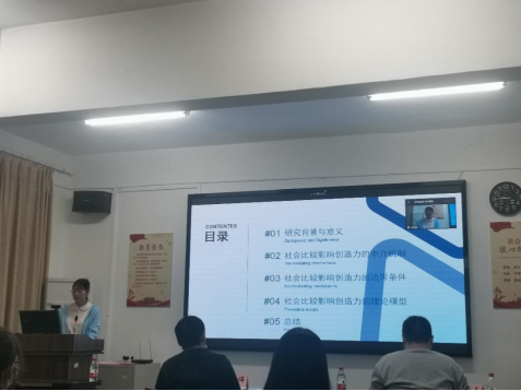第四位是聂艳红同学,她就“社会比较对创造力的影响及其机制”作了汇报,分析了社会比较影响创造力的中介机制、边界条件与理论模型,提出了综合的假设模型。