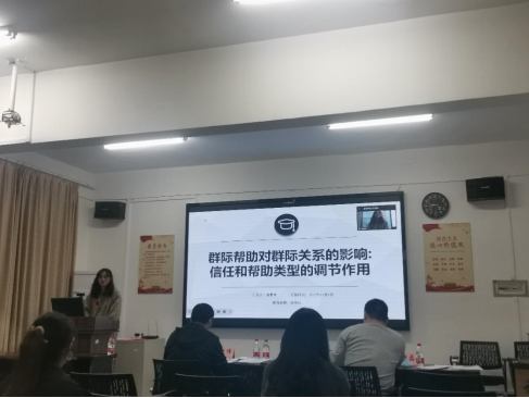 第二位周勇琴同学,她就“群际帮助对群际关系的影响:信任和帮助类型的调节作用”作了汇报。周勇琴同学首先说明了研究背景,其次分析了目前关于群际关系的研究现状,并阐述了研究目的,最后讲解了自己的实验设计。