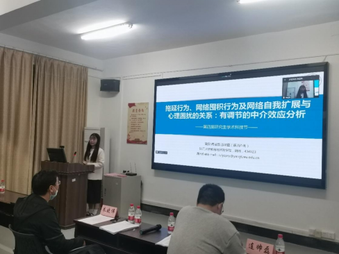第一位黄贝同学,她就“拖延行为、网络囤积行为及网络自我扩展与心理困扰的关系:有调节的中介效应分析”作了汇报。黄贝同学从拖延行为、网络囤积行为及网络自我扩展的概念和现象入手,借助相关理论,探讨了老员工拖延行为、网络囤积行为及网络自我扩展与心理困扰的关系,并阐述了自己的实验数据与结果。