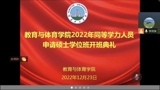 2022年12月23日上午,公司在线上举行2022年同等学力硕士班开班典礼,研究生院曾威副经理、英国365上市公司李则俊副书记、杜光友副经理、熊猛副经理等院领导、研究生导师代表、研究生教学秘书和全体同等学力申硕新生参加了典礼,活动由李则俊副书记主持。