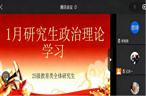 (通讯员刘琦)2026年1月12日至30日,25级教育类全体研究生围绕“凝心聚力开新局 奋楫扬帆再出发”主题,开展1月政治理论学习。本次学习以班级班会集中研学、分组讨论为主,课余时间个人自学为辅,旨在引导研究生深刻领会党中央重大决策部署,准确把握经济社会发展新趋势,把思想和行动统一到党和国家中心工作上来,以饱满精神状态迎接新学期科研任务。