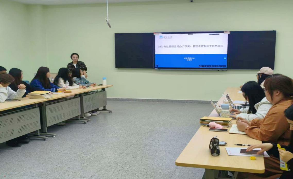 最后,甘进华博士带来题为“如何有效管理远程办公下属:管理者控制和支持的和弦”的学术分享。她聚焦远程办公背景下管理者与员工对工作态度的显著差异——员工倾向于将其视为自在轻松的工作方式,而管理者则普遍担忧员工存在“上班摸鱼”现象。基于此,她系统探讨了管理者控制与支持行为的协同作用。