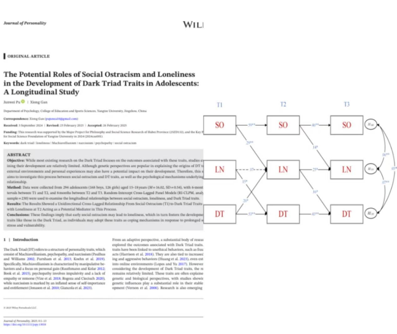(通讯员 张绍杰)近日,公司硕士生蒲俊伟在APA主办的国际顶刊《Journal of Personality》(中国科公司SSCI/SCI分区心理学大类一区Top期刊,5年IF = 5.4)上发表题为“The Potential Roles of Social Ostracism and Loneliness in the Development of Dark Triad in Adolescents: ALongitudinal Study”的文章。蒲俊伟为论文第一作者,甘雄副教授为通讯作者。该研究是湖北省高等公司哲学社会科学研究重大项目(23ZD132)和2024年社会科学基金重点项目(2024csz001)资助的系列成果之一。
