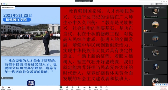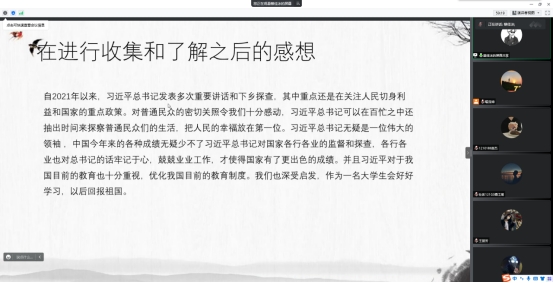 通过本次线上分享活动,同学们进一步了解了习近平总书记重要足迹的意义,以及习近平总书记有关教育的重要讲话的精神,明白了自身所学专业的未来发展意义,正如同学们所想的,作为一名老员工要好好学习,回报祖国。