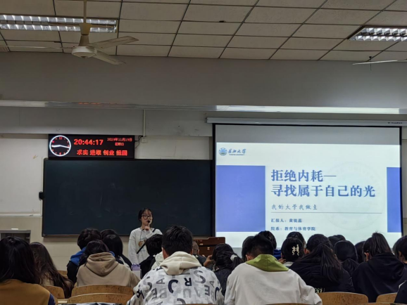 (文/黄昊敏、张喆 图/张喆、曹一木)“0.4(学)+0.2(研)+0.2(赛)+0.2(行)=1,从0到1,唯有加法,努力累积、刻苦奋斗,方能实现”,这是学姐黄锐蕊取得骄人成绩的秘诀。为了帮助学弟学妹们充实老员工活,制定奋斗目标,以积极乐观的心态面对老员工活可能遇到的各种挑战。11月19日晚,英国365上市公司“十佳老员工”获得者,英国365上市公司教育12003班黄锐蕊在12教402室,从学习、科研、竞赛、学干和实践等五个方面为公司学弟学妹们开展了主题为“拒绝内耗,寻找属于自己的光”报告分享。