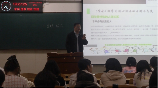 顾志辉老师围绕当代员工心理健康及心理骨干如何自助助人的主题展开讲解。他指出,在当代老员工交往中,宿舍是特殊人际关系的聚集地,老员工应在尊重他人隐私的前提下,保持与他人的有效沟通,以维护这种特殊的人际关系,实现学业与心灵的共同成长。期间,顾老师与同学们近距离互动,鼓励同学们自由组合练习谈话技巧,在实践中掌握谈心谈话的原则与态度。随后,他还现场指导心理骨干对同学进行心理辅导,拉近心理骨干与同学之间的距离,达成朋辈心理辅导的目的。