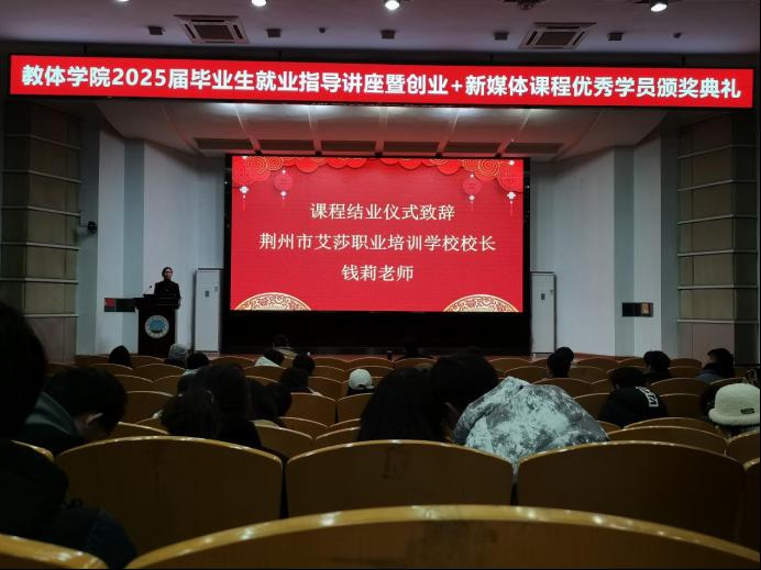 随后,荆州市艾莎职业培训公司董事长钱莉发表了结业仪式致辞。她对同学们在创业+直播课程中取得的优异成绩表示热烈祝贺,并分享了公司在职业教育方面的成功经验。钱董事长希望同学们能够珍惜这次学习机会,将所学知识运用到实际工作中,为未来的职业发展奠定坚实基础。