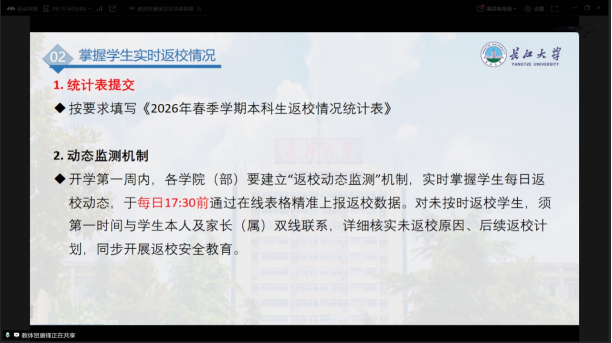 会后,公司以年级、班级为单位线上全覆盖召开返校安全教育班会,辅导员、班主任全员参会,为全体员工开展系统性返校安全教育。班会围绕安全出行、消除安全隐患、提防诈骗、远离不良网贷、到校管理、身心健康、寝室安全、网络舆情安全八大要点,向员工详细讲解返校注意事项:明确2月28日、3月1日报到注册、3月2日正式上课的时间节点,以及宿舍开放安排;要求员工返校前确定行程并告知家长,通过正规渠道购票,做好出行防护;返校后严格遵守宿舍管理规定,自查消防隐患,杜绝使用大功率电器,做好寝室水电、财物安全防护;提醒员工增强防诈和网贷风险意识,不泄露个人信息、不轻信陌生来电短信,树立理性消费观。