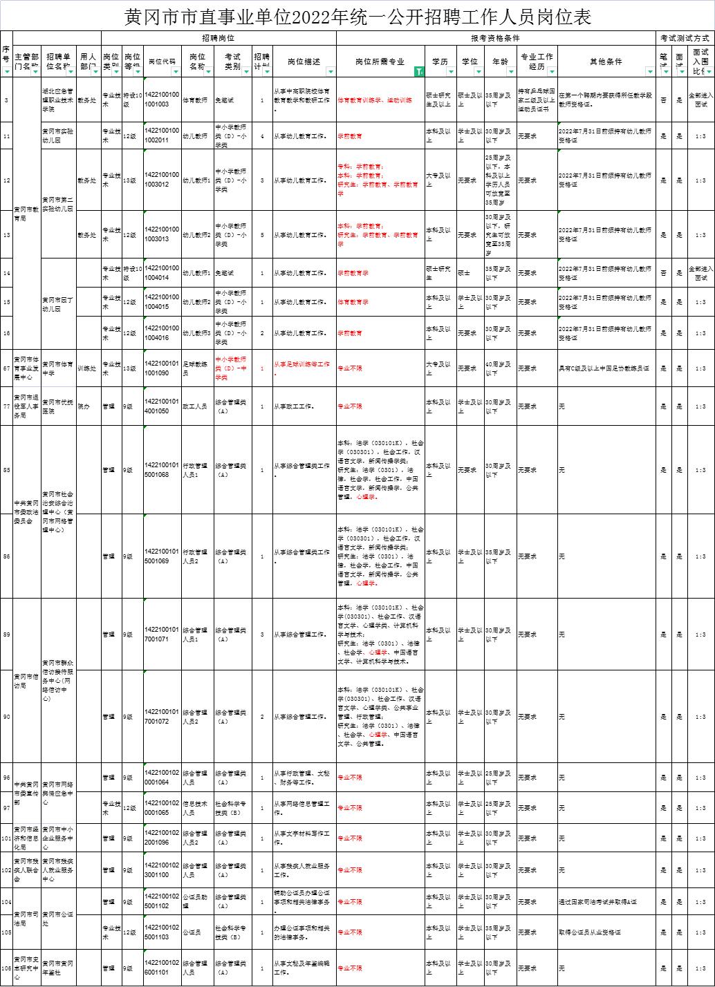 黄冈市市直事业单位2022年统一公开招聘工作人员公告http://rsj.hg.gov.cn/art/2022/4/2/art_10307_1581407.html 岗位表: